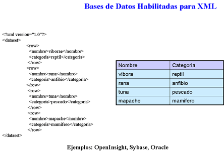 En un inicio, las bases de datos habilitadas para XML convertían la información a un esquema relacional y los queries se hacían en SQL, hoy día es posible no solo recuperar los resultados formateados en XML, sino interrogar a ese esquema relacional usando XPath o XQuery.