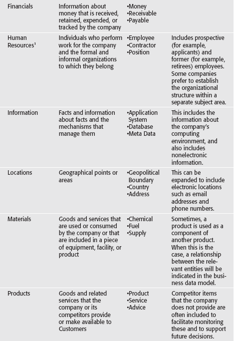 Subject areas son grupos de cosas/temas de interés para la empresa/problema. Estos temas de interés son representados con entidades. Usualmente se tienen entre 15 y 20 subject area models Los modelos de temas se pueden generar rápidamente, debido a que muchas empresas/contextos poseen practicamente los mismos temas.