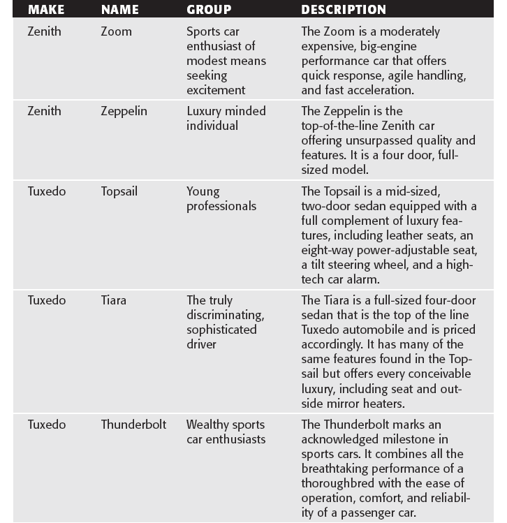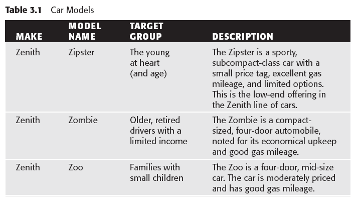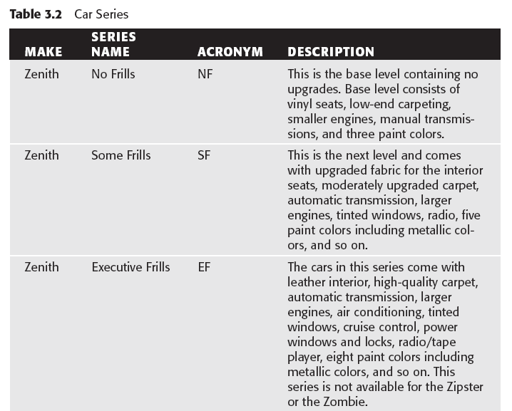 2.4.1 Business scenarioAnalicemos lo anterior con un ejemplo, pensemos en una compañía de autos, Zenith Automobile Company (ZAC). ZAC fundada en 1935, manufactura 2 vehículos Zeniths y los de lujo, Tuxedos; cada uno con 3 series disponibles.