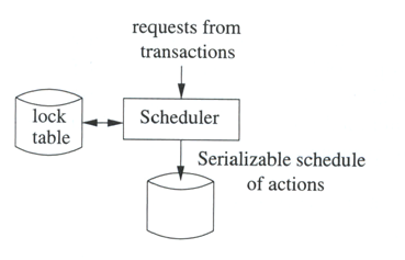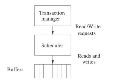 10.3 Control de concurrencia10.3.1 IntroducciónEl control de accesos concurrentes y específicamente de transacciones concurrentes es manejado por un módulo del dbms llamado "scheduler". Es importante recordar que muchos de los datos de la base no se encuentran nada más en disco, sino tambien en los buffers de memoria, de ahí que el scheduler interactúa con ellos y en su defecto solicita la lectura de los datos del disco.