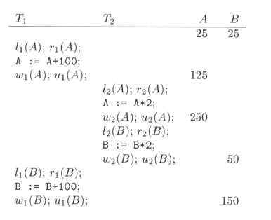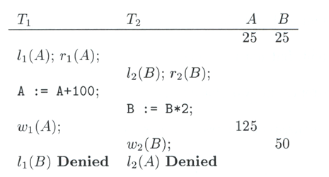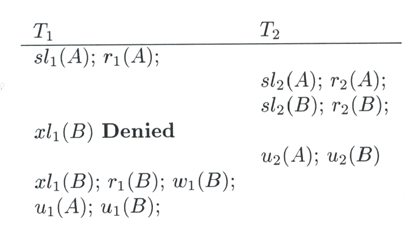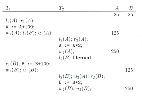 Locking retrasando una petición para evitar un illegal schedule 10.3.5.2 Two-phase locking (2PL)"En toda transacción, todos los locks preceden a todos los unlocks". Para los últimos 2 diagramas de la sección 10.3.5.1, el primero no cumple con 2PL y el segundo cumple 2PL. El problema de 2PL, caer en un deadlock