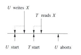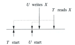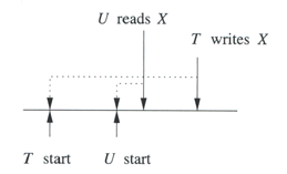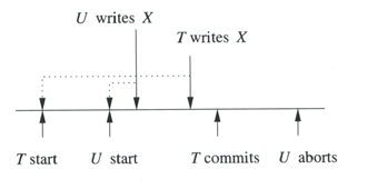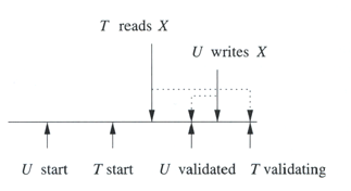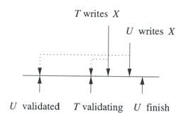 Write cancelled 10.3.7 Control de concurrencia por Validation10.3.7.1 Validation Muy similar al timestamp la diferencia radica en que el scheduler mantiene un registro de lo que están haciendo las transacciones mas que tener los tiempos de cada r-w por cada elemento.