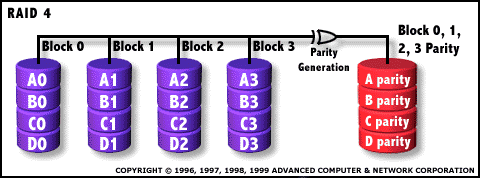 - Un disco está dedicado exclusivamente a guardar el bit de paridad, de manera que si algun disco falla los datos se puede recuperar gracias a este bit.