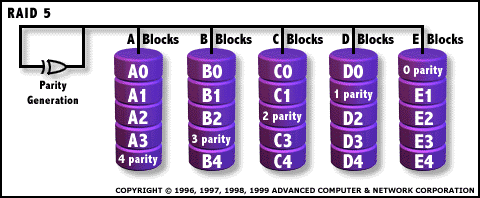 - Similar a RAID3 con la diferencia que la paridad se almacena por bloques.