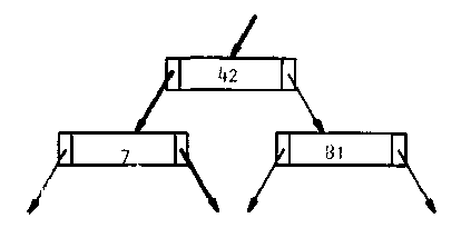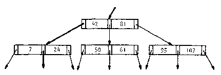 Este árbol es muy similar a los que ya hemos presentado anteriormente y que seguramente también es el más popular cuando hablamos de estructuras de datos. Pero este árbol no necesariamente tiene que tener únicamente un registro (para nuestro caso una llave), la Figura 7.6 muestra un árbol donde cada nodo posee dos llaves y 3 ligas o salidas hacia los siguientes niveles. Se puede observar que para el caso de la raíz el camino de la izquierda representará la ruta hacia aquellas llaves menores que 42, mientras que el de la derecha representará aquellas que sean mayores que 81 y la del centro aquellas que sean mayores a 42 pero menores a 81.