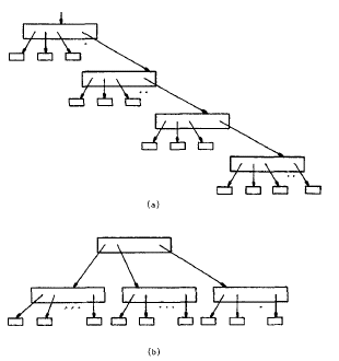 Una de las grandes ventajas de los B-Trees son sus métodos de inserción y eliminación ya que mantienen balanceado el árbol a diferencia de los tradicionales donde se podría tener un caso donde se tenga un acceso secuencial (Figura 7.8a) donde no se aprovecha en nada la estructura de árbol, mientras que el B-Tree siempre mantiene una forma piramidal (Figura 7.8b) gracias a su balanceo.