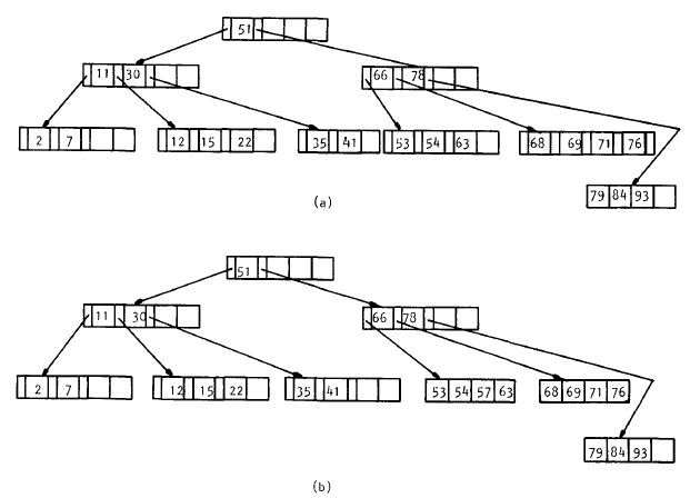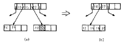 Para este último caso lo único que se necesita es una llave prestada desde una hoja vecina, pero como de todas formas se necesitan 2 lecturas a disco una mejor distribución se puede hacer, dividiendo las llaves que restan entre los dos nodos vecinos (Figura 7.12) de modo que se reducen los accesos de las próximas eliminaciones en ese nodo.