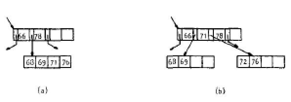 Por otro lado si quisiéramos insertar la llave "72" veríamos que su lugar sería en el nodo donde están (68,69,71,76) el cual como se puede observar ya se encuentra "lleno" de manera que debemos dividirlo (split) como se observa en la Figura 7.10. De manera que las llaves más pequeñas pertenecerán a uno de los nodos (68,69), las llaves más grandes al otro nodo (72,76)  y finalmente la llave intermedia (71) se promocionará como separador en el nivel superior (acompañando al 66 y 78). Algo muy importante a considerar es qué sucede cuando esta "promoción" se hace hacia un nodo superior que ya se encuentra lleno, entonces ese nodo se deberá dividir y en caso de ser necesario se hará sucesivamente hasta llegar a la raíz en cuyo caso estaremos hablando de que el árbol habrá crecido en un nivel.