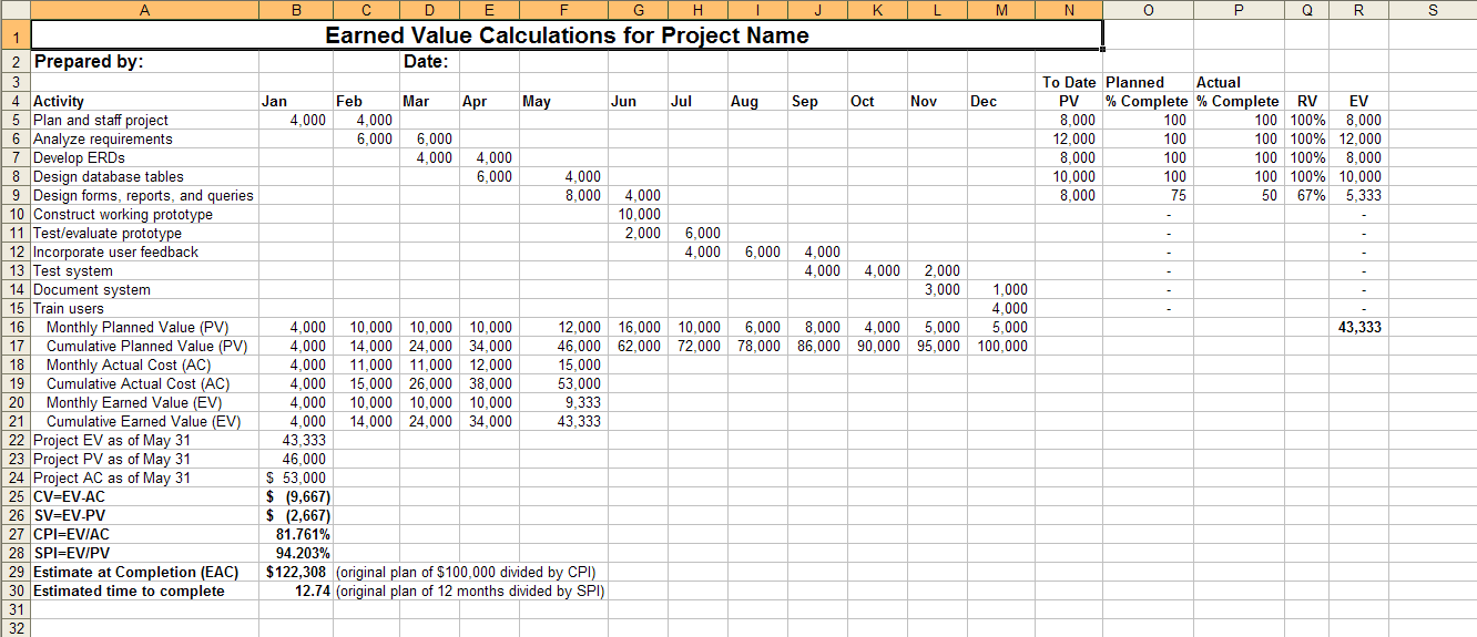 Se analiza que la instalación de un servidor estaba completado a la mitad al final de la semana 1 y el costo incurrido es de 15,000 usd. El rate of performance sería del 50 % (50/100) porque para el final de la semana 1, el calendario refleja que la tarea debería estar al 100%, pero solo el 50 % está completado.