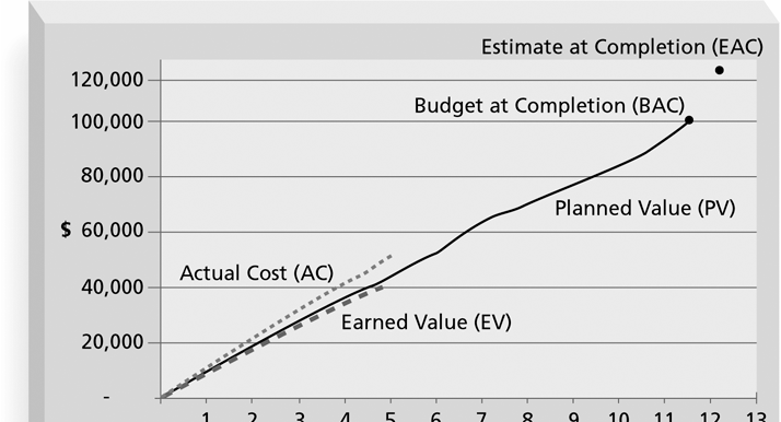 Estimate at Completition (EAC) es BAC / CPI, un estimado de cuanto costará terminar el proyecto basándose en el rendimiento mostrado hasta el análisis.