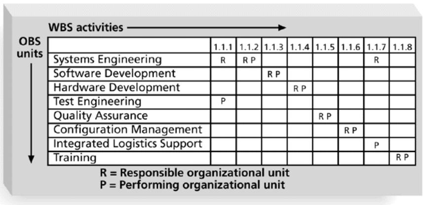 Responsibility Assignment Matrixes Una responsibility assignment matrix (RAM) es una matriz que mapea el trabajo del proyecto, descrito en el WBS, a la gente responsable de realizar el trabajo, descrita en el OBS. Puede ser de distintos tipos (individuales, por grupo, por roles) de acuerdo a las necesidades.