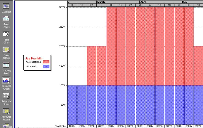 Resource Loading Resource loading se refiere a la cantidad de recursos individuales que un calendario requiere durante un periodo específico de tiempo. Ayuda a los project managers a desarrollar un entendimiento de las demandas de un proyecto, su impacto en la organización y en los calendarios de la misma gente. Overallocation significa que se han asignado más recursos de los disponibles se han asignado para realizar una tarea en un cierto tiempo. Sample Histogram Showing an Overallocated Individual