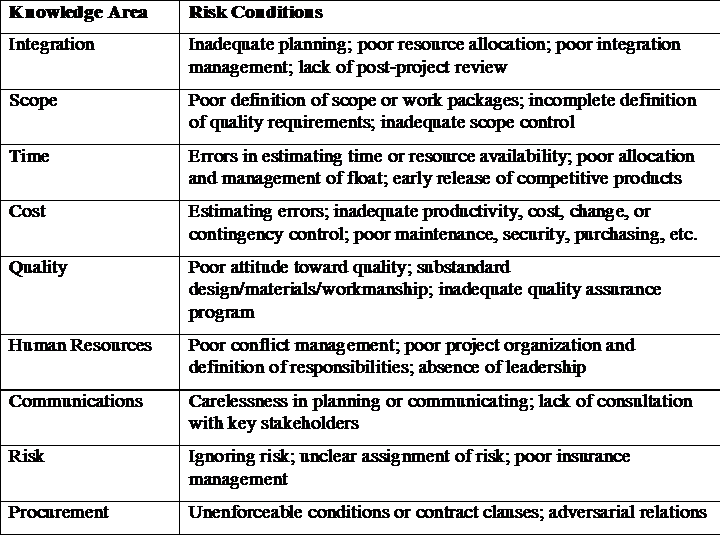 Potential Negative Risk Conditions Associated With Each Knowledge Area
