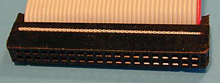 Un conector IDE/ATA en un disco (arriba) y un cable regular de 40 conductores IDE/ATA cable (abajo).