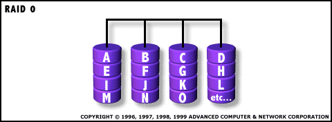 - Almacena toda la información en diferentes discos pero a nivel byte.