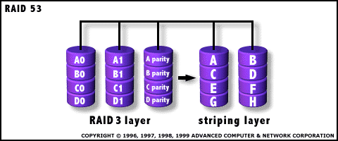 - Es un arreglo de clases (stripes), cada una de ellas compuesta por un arreglo de discos con RAID3